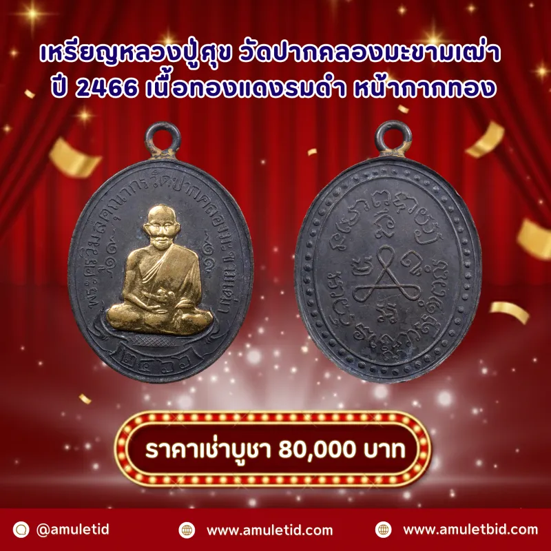 เหรียญหลวงปู่ศุข วัดปากคลองมะขามเฒ่า ปี2466 เนื้อทองแดงรมดำ หน้ากากทอง |