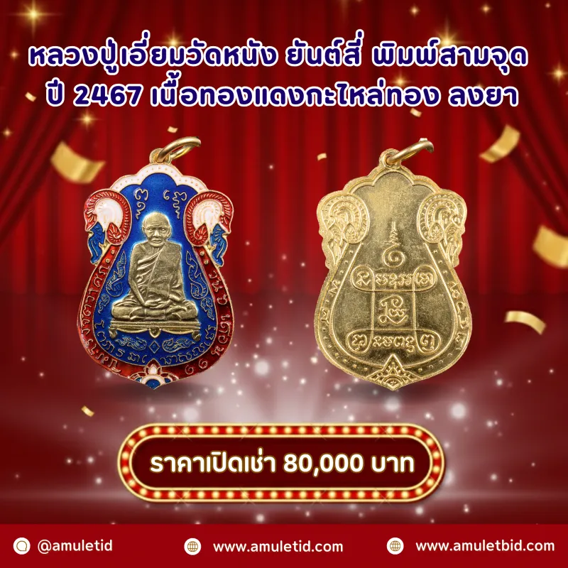 หลวงปู่เอี่ยมวัดหนัง ยันต์สี่ พิมพ์สามจุด ปี 2467 เนื้อทองแดงกะไหล่ทอง ลงยา